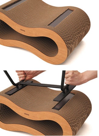上に乗って爪を研いだり曲線に沿って寝転んだり、 中に入ってひと休みをしたり。 段ボールの特徴でもあるラインを活かし曲線の流れを意識し設計した美しい爪とぎだ。