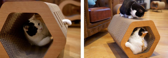 爪とぎトンネルと、 のぞき穴の六角形のキャットスクラッチです。 六面どこでも爪を研ぐことができ、 上に乗ったり中をくぐって遊んだり。