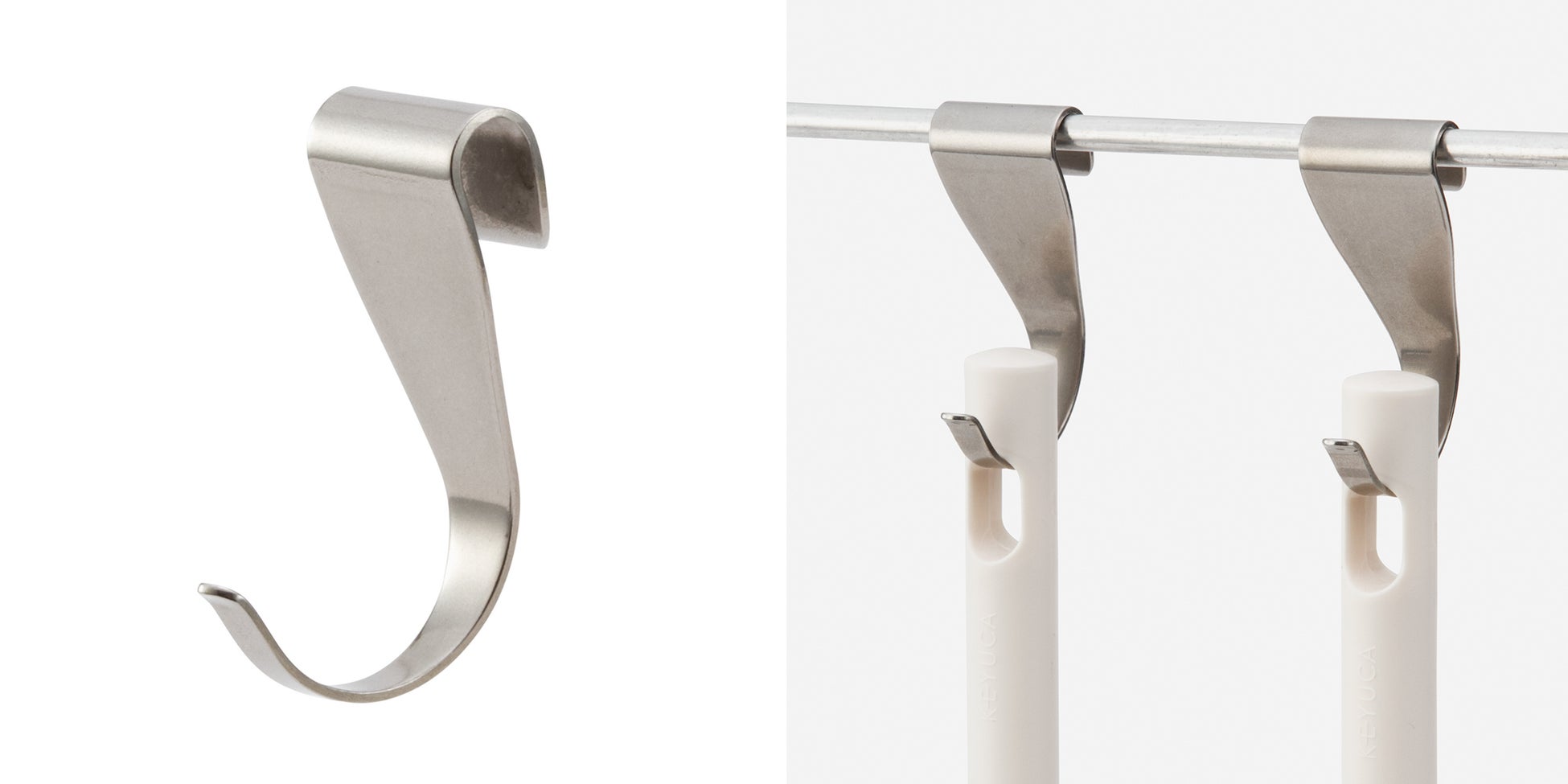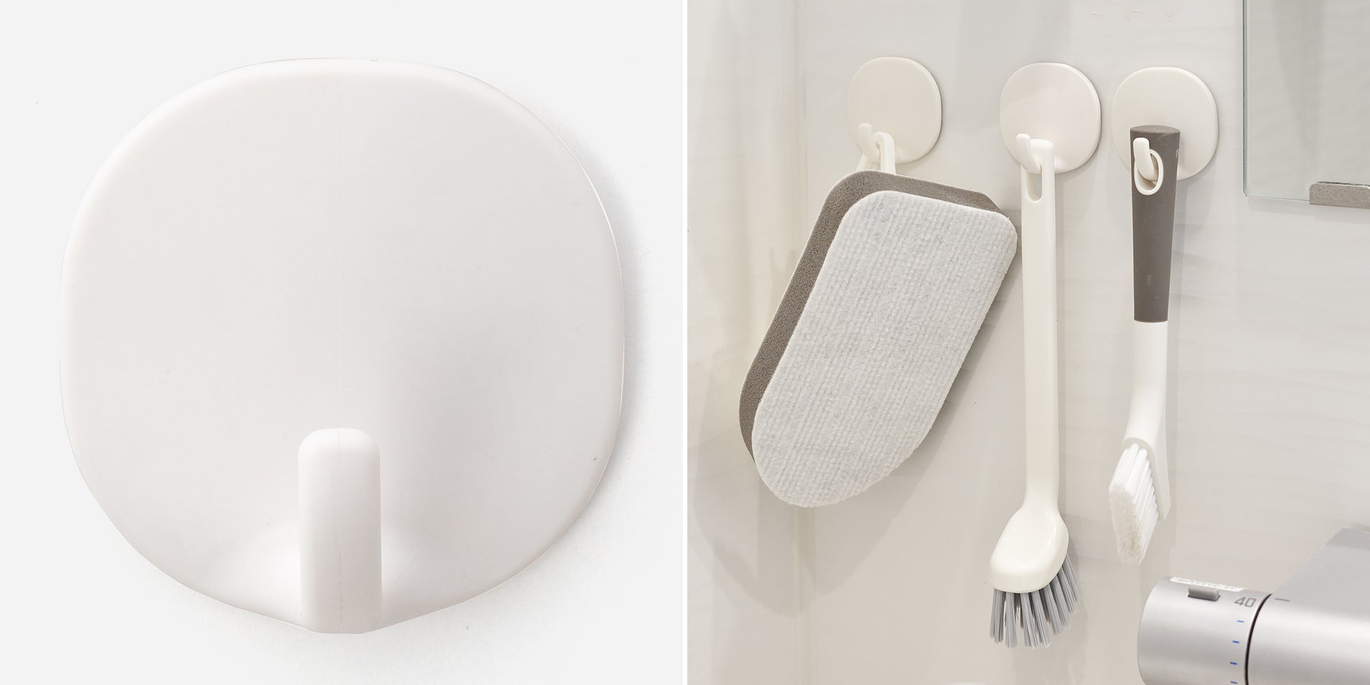 掃除用のブラシやスポンジ、小さめの湯桶などをかけて収納できるフック。フック先端部はさまざまなアイテムが引っかけられるように細めにつくられているため、キッチンでお使いいただくのもおすすめです。ほかのアイテム同様、丸みのある形状でやわらかな雰囲気にすることで、壁面に取り付けてもなじみやすく程よくスタイリッシュな印象が特徴的なデザインです。