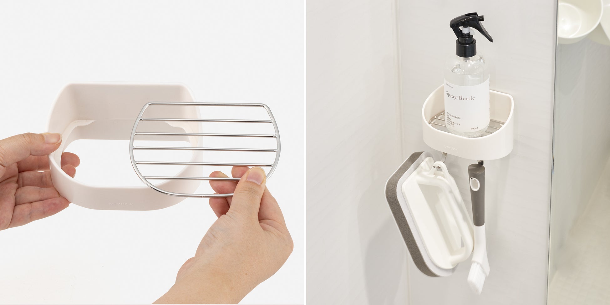 清掃性の良さとデザイン性のどちらも兼ね備えたマグネットミニシェルフ。棚板となる面を金網にすることで石けんとの接地面を減らして水はけを良くし、ぬめりや溶けて張り付く問題を軽減します。18-8ステンレス鋼を採用することでサビにくく、お風呂場でも安心して使えるアイテムに仕上げました。金網は取り外すことができるのでお手入れも簡単です。その他にも、チューブ型容器や子どものおもちゃなどの小物を置くこともできます。