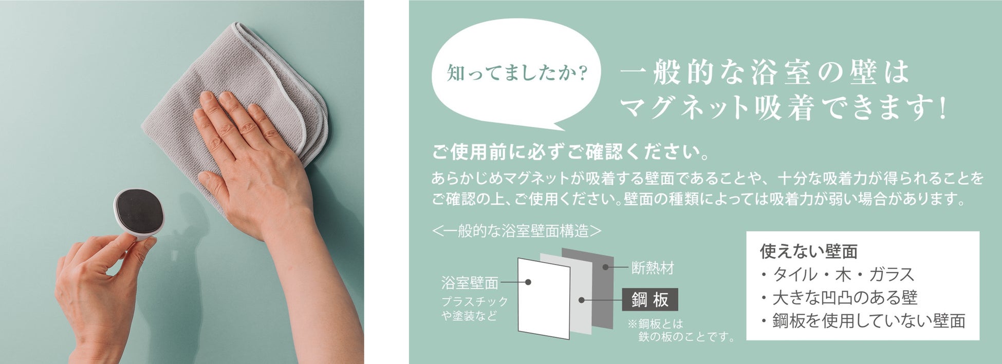 多くの浴室壁面の構造の裏側には鉄の板が使われているため、壁にマグネットを取り付けることができます。吸盤タイプでは耐久性に不安を感じる方も多いことから、KEYUCAでは浴室でもサビにくく長く使えるラバーマグネットを採用しました。壁面の好きな位置に取り付けることができ、取り外しも簡単にできるので、お手入れも位置調整も自由自在です。