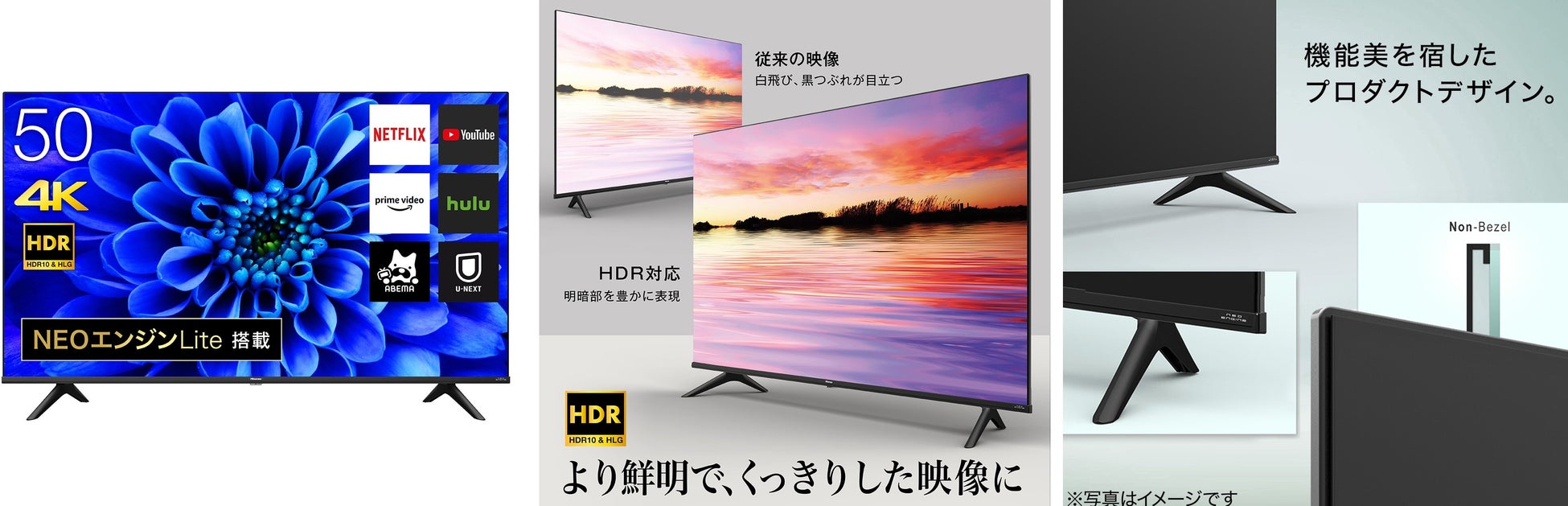シンプルなデザインでどんなインテリアにも馴染みやすいテレビ。「HDR(ハイ・ダイナミック・レンジ)」対応のため、従来の一般的なテレビに用いられてきた「SDR(スタンダード・ダイナミック・レンジ」よりも、鮮明でくっきりとした映像で視聴いただけます。