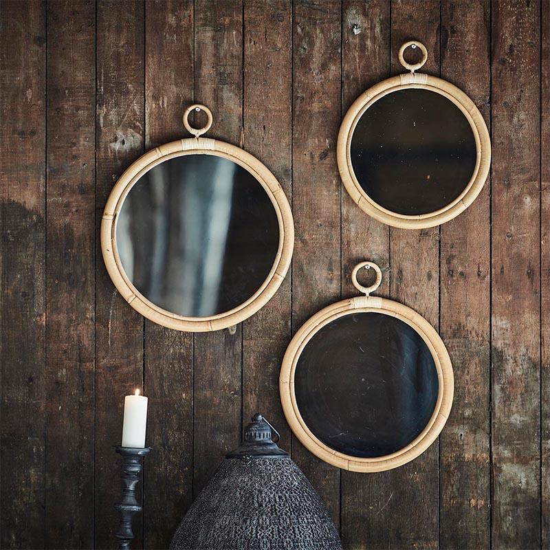 ラタンとミラーの組み合わせが、自然な品を感じさせる壁掛けミラー。モダンな空間や和室にも良く合い、ほど良い柔らかさをもたらす。