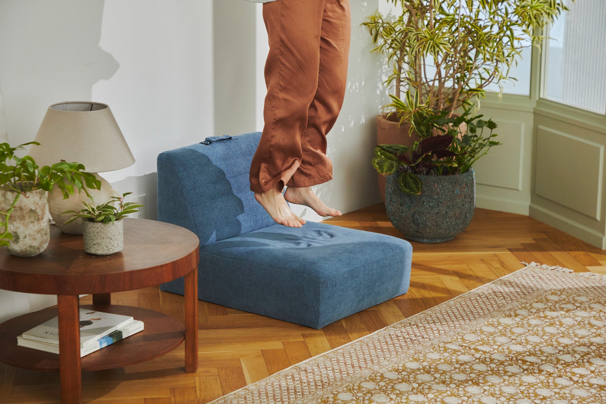 おうち時間の増加を機に、ホームエクササイズグッズの需要が高まりました。中でもトランポリンは大人気。暮らしにとけこむホームエクササイズブランド「gymterior(ジムテリア)」が発売した新感覚ファブリックトランポリン「シェイプキューブ」は、2020年9月の発売以来、売上累計15万個を突破(シリーズ累計、2022年1月現在)。