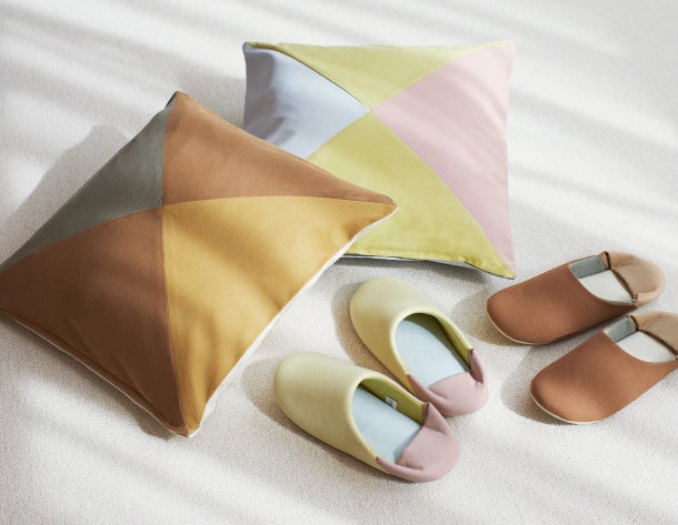 『FOOD TEXTILE』が持つ、廃棄予定の野菜やフルーツなどから抽出した500色の染料からunicoがカラーをセレクトし、カーテン、クッションカバー、寝具、バブーシュなど様々なインテリアアイテムに落とし込んでいる。