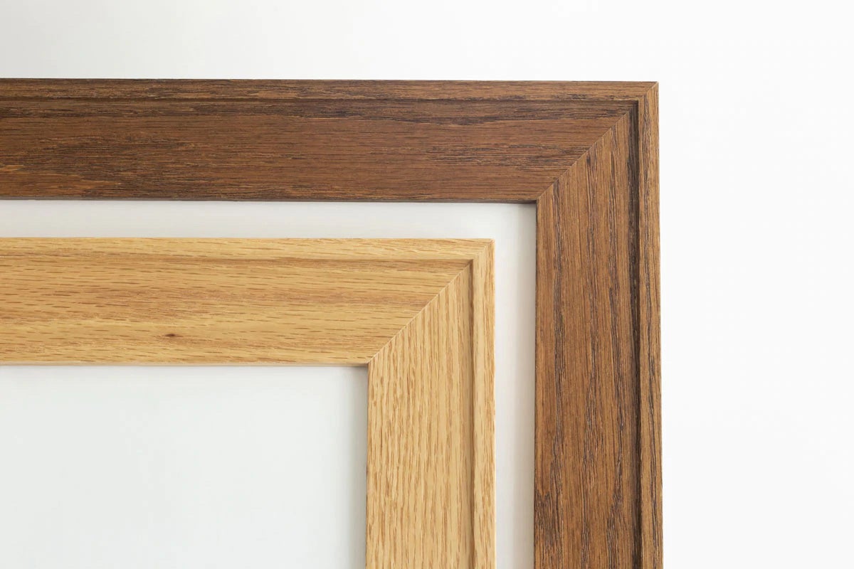 木製フレームは、ナチュラルとブラウンの2カラー展開。レッドオーク材の突板を用いたフレーム部分は、約4cm の縁幅を作って、個性的な木目の表情を愉しめるようにしました。