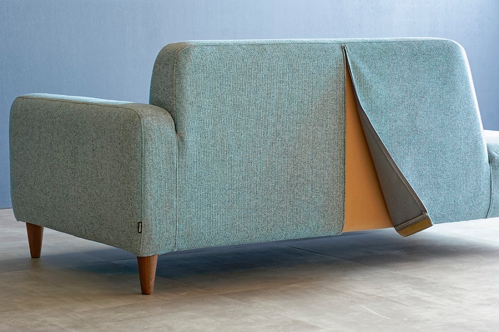 木枠から縫製まで一貫製造しているブロッコのソファ技術を生かし、1人でも簡単に着脱できるフルカバーでありながら、張り込みソファのようにピシッと張られ、座っている時にはズレない設計を実現。フルカバーリングソファには見えない上質な仕上がりです。
