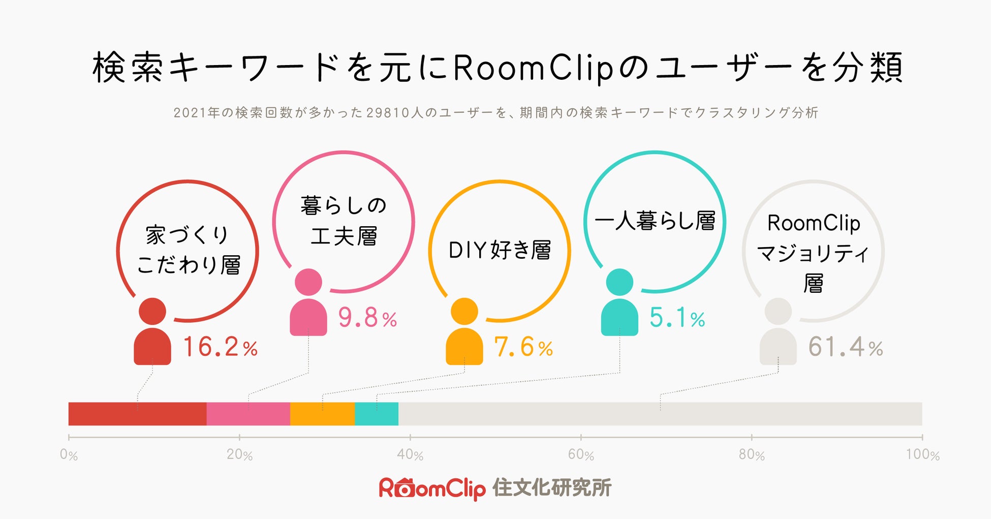 サービス開始10周年を記念し、RoomClipを利用するユーザーの特徴ごとに5つのグループに分析し、検索キーワードや保存をしている投稿などの情報とあわせて詳報します。