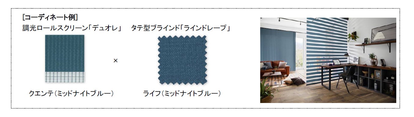 昨今の働き方や個々のライフスタイルの多様化により、住宅やインテリア市場においても、ユーザーが自分の価値観にあったものを取捨選択し、自分らしさを追求する傾向にあります。そこで、ロールスクリーン「ラルクシールド」やタテ型ブラインド「ラインドレープ」で人気の生地「ライフ」とコーディネートできるカラーを1.5倍に増やし、ロールスクリーンやタテ型ブラインドとのコーディネートを強化。さらに、リーフグリーンやミッドナイトブルーなどのトレンドカラーを新たに取り入れ、ユーザーがインテリアに合わせて選びやすいラインナップとなりました。