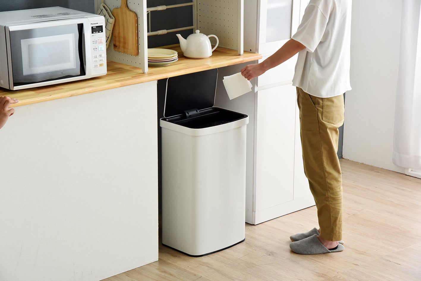 非接触でフタの開閉を行うことから、キッチンに置けば、料理などで両手がふさがっている場合でも、手を伸ばすだけで簡単に生ゴミを捨てることができてとても便利です。