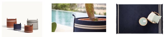 アウトドアシーンに個性を加える屋外用バスケットとラグ。ステッチとフリンジがアクセントのラグは、摩耗に強く、耐候性を備えています。ポリプロピレンの組み紐を縫い合わせたバスケットは、植木鉢や植物を入れるのに最適な大バスケットと、クッションやブランケットや小物の収納におすすめの小バスケットの2サイズ展開です。両アイテムともエクリュ、ブルー、さび色のカラーバリエーションがあり、屋外スペースに彩りを添えてくれます。