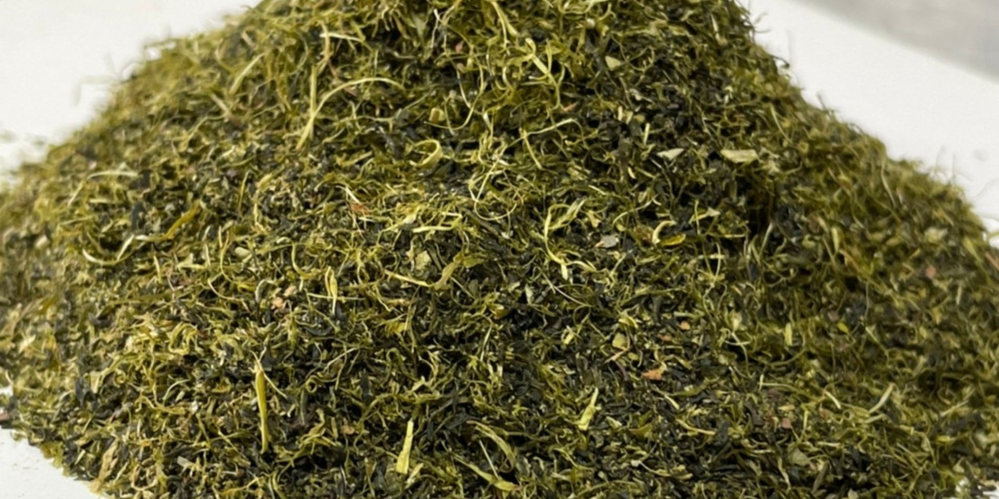 茶葉の火入れや揉みの過程で発生する枝葉のカスや粉状のもので、多くの湿気を含むため、常温保管が難しく商品への転換が困難とされてきました。粉茶を取得してから数日内に高圧機にかけることで、フレッシュな状態の香りを抽出することを実現しました。