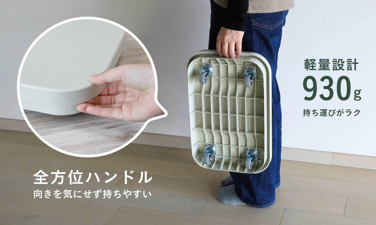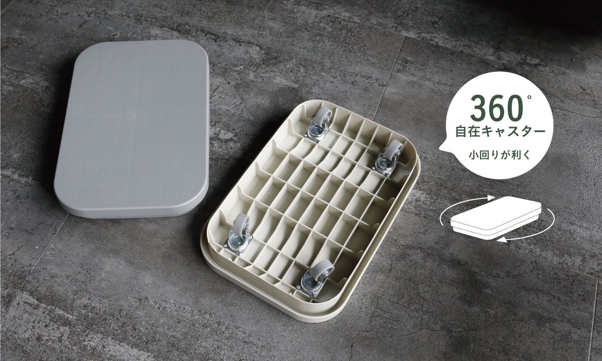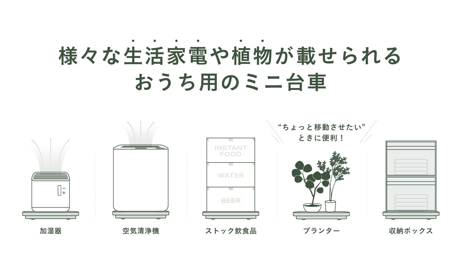 んなちょっとした物の移動や配置変更の不便さを解決出来るのが、おうち用の「ホームカート」です。毎日使う生活家電や植物・収納ケースの下に「ホームカート」をセットするだけで、気軽に『物を移動』させることが出来ます。
