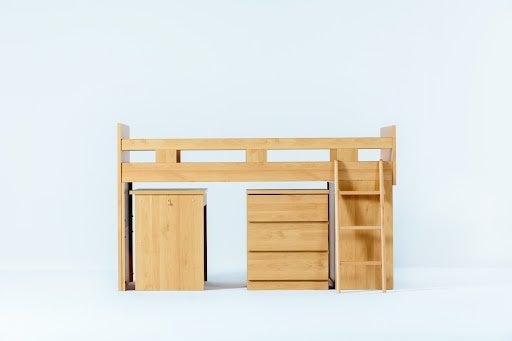 組み換え式国産システムベッドです。ベッド下のスペースに、机とチェストを収納できるようになっており、子供部屋を無駄なく使用できる機能性にこだわった省スペーススタイルです。
