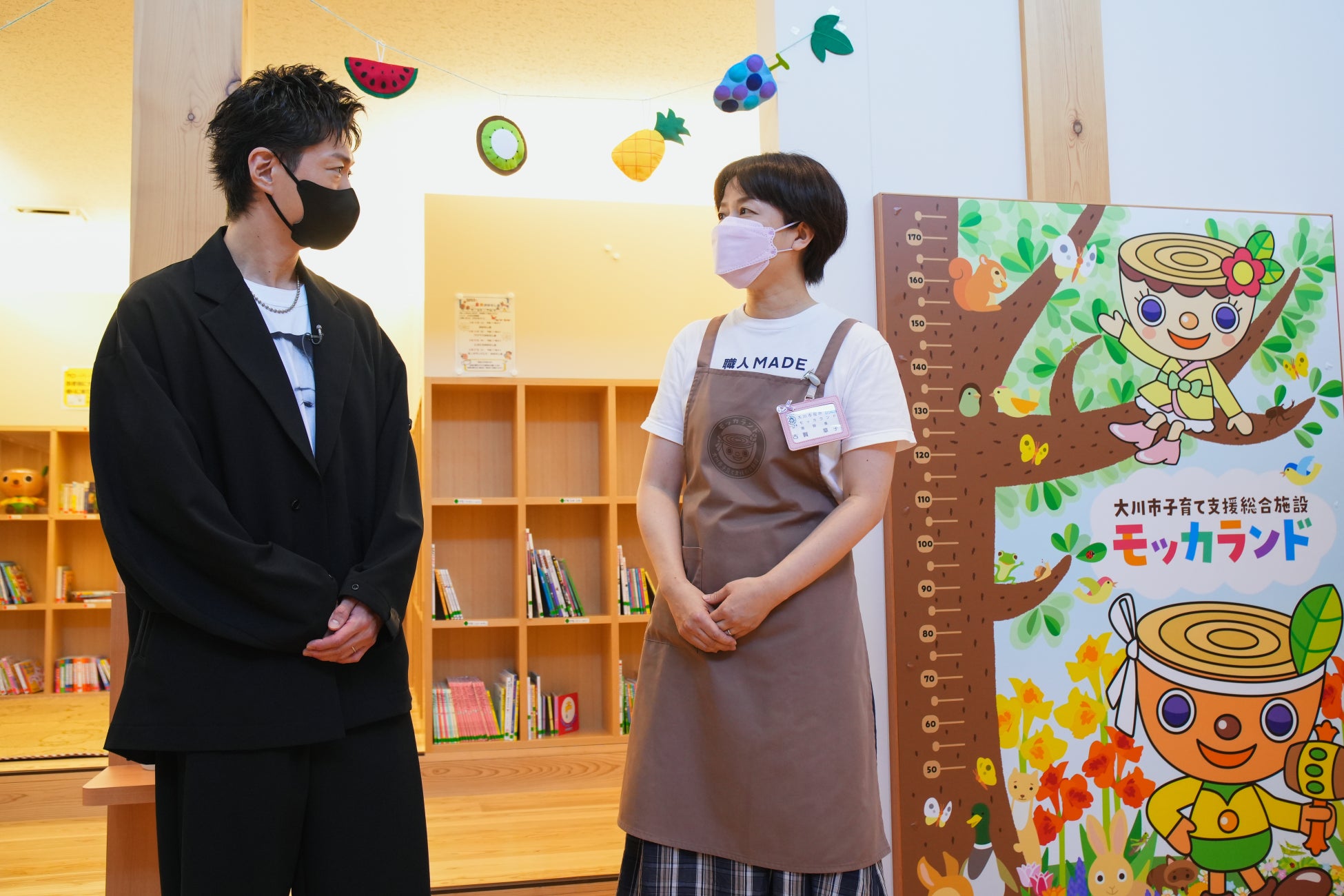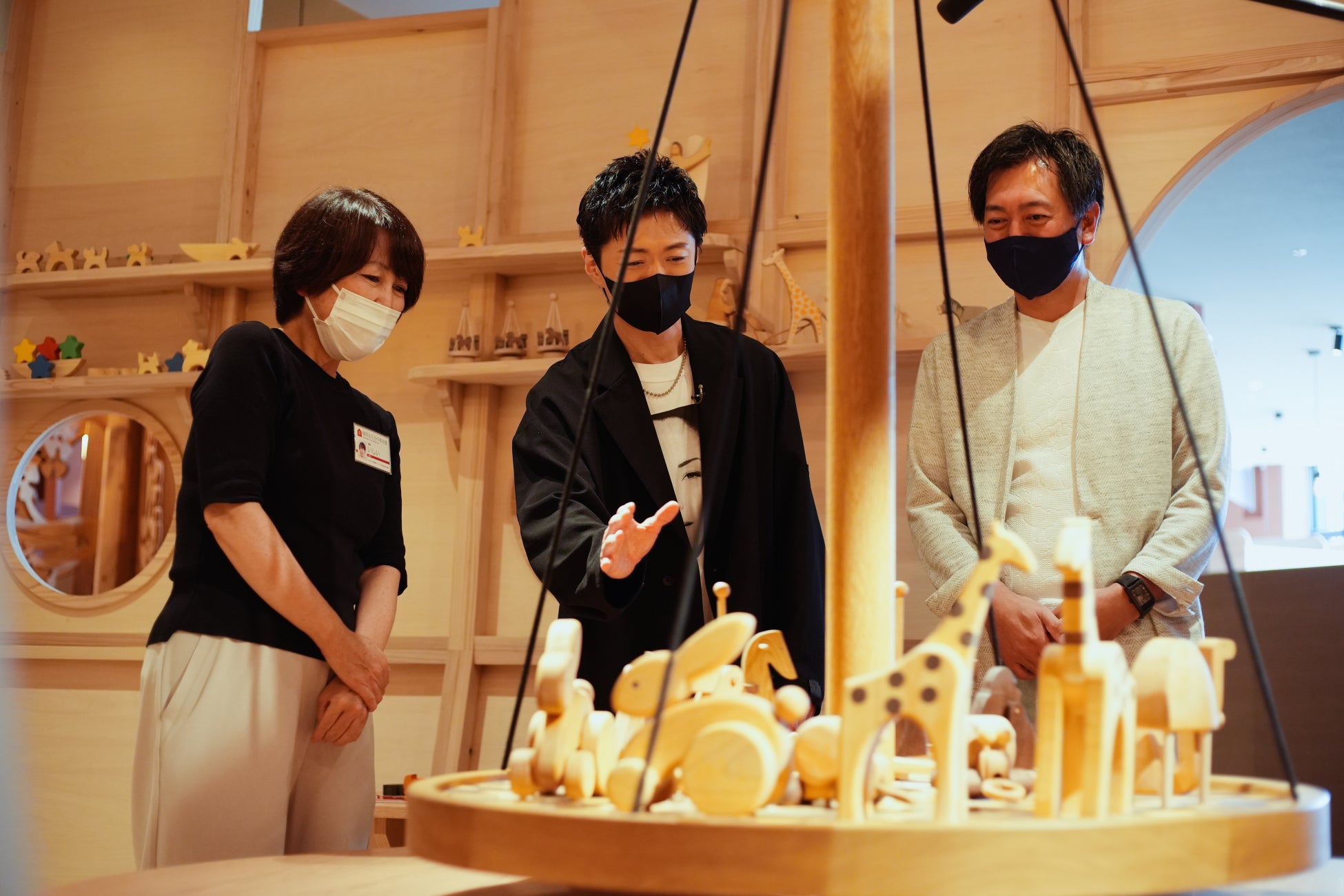 8月に「2022年度大川家具スペシャルアドバイザー」に就任し、「大川カグミライプロジェクト」ではチャイルド家具担当になったMAKIDAI氏。まずは大川市役所の担当者からチャイルド家具についてヒアリング。また、ヒントを探るため、大川家具のチャイルド家具の先駆者的な家具事業者『広松木工』、大川市の子育て支援施設『モッカランド』、また大川家具のおもちゃが多数展示されている福岡市内の『福岡おもちゃ美術館』の3箇所を取材しました。