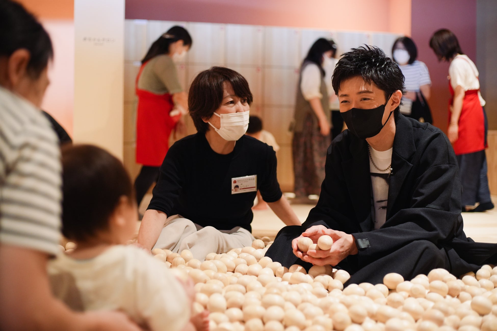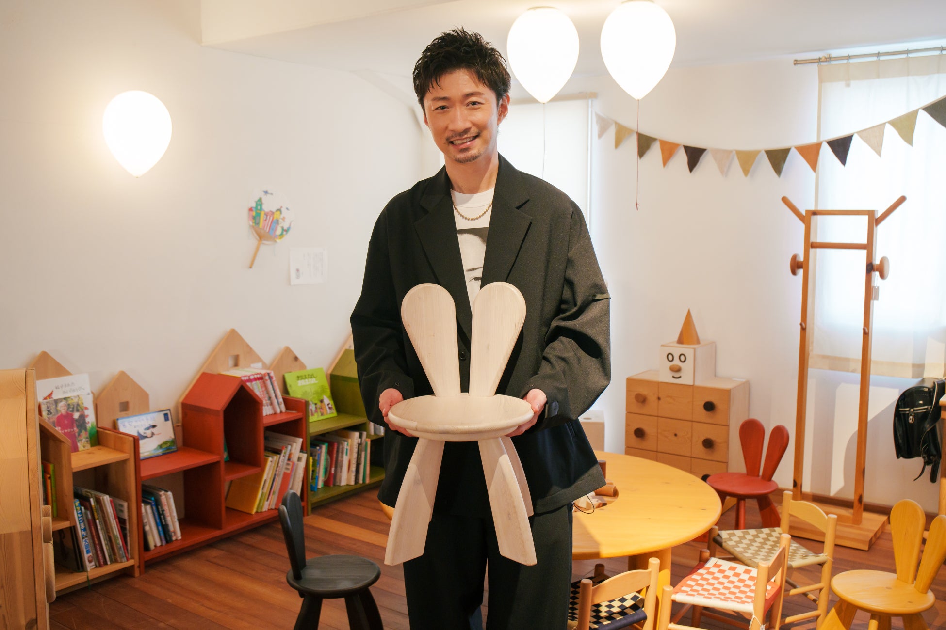 取材当日もたくさんの子どもたちが楽しそうに遊んでいて、その様子を優しく見守るMAKIDAI氏。施設内には、福岡ならではの、すべて木でできたラーメンのおもちゃなどもあり、MAKIDAI氏もびっくり。木の可能性を感じられるおもちゃの数々に、インスピレーションを得たようでした。